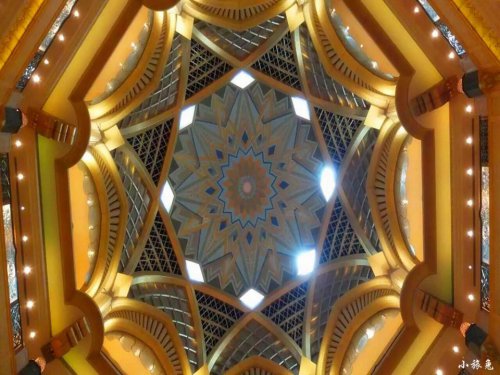 該酒店耗資近30億美元,坐擁85公頃園林和1.3公里黃金海岸,是一座古典式的阿拉伯皇宮式建筑。酒店的外形仿佛是一座水上清真寺,有著濃郁的中東風情。其內部更是金碧輝煌。據說耗盡22噸純金打造,更有海量的大理石、價值不菲的油畫裝飾和上千盞特別定制的施華洛世奇水晶吊燈……據說,有10名工作人員專職保持其清潔。
