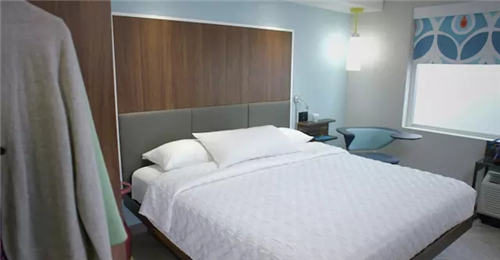 客房設計也以打掃起來簡單快捷為首要目標。傳統的希爾頓酒店鋪地毯,而 Tru 使用乙烯基地板,清潔工只需要拖地就能完成打掃。為了減少清潔時間,客房內也取消了書桌和咖啡機。只有最基本的床、電視機、窗戶和充電插口。
