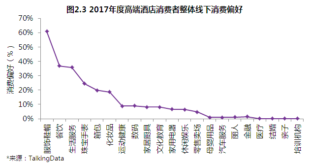 通過分析高端酒店消費者基本屬性后,我們已經(jīng)圈定了高端酒店的目標(biāo)消費人群,那么這些人群在實際線下消費過程中有哪些偏好呢?從宏觀消費類型來看,服飾鞋帽、餐飲、生活服務(wù)是高端酒店消費者主要消費的三種產(chǎn)品類型。這些消費多以大眾品牌消費為主,占比達46%,奢侈品牌僅占10%,與國內(nèi)平均消費水平基本吻合。