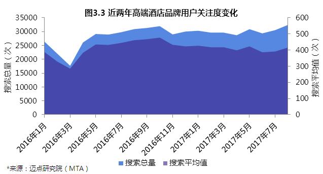 就用戶關(guān)注度方面而言,2017年高端酒店品牌的整體搜索情況有所提升,品牌對消費者的吸引力較高。但在搜索平均值方面,受品牌進入時間及成熟度影響,各個品牌之間的關(guān)注度有一定差異,且這一差異正進一步拉大,導(dǎo)致今年高端酒店品牌的搜索平均值有小幅下降趨勢。