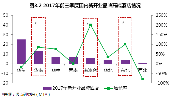 與目前高端酒店市場地區(qū)分布不同,2017年前三季度,港澳臺及華南地區(qū)開業(yè)的品牌高端酒店有較大幅度的增長,增長率均超過100%,顯示出了強大的市場潛力。這兩個地區(qū)高端酒店市場相對成熟,因此更容易吸引海內(nèi)外品牌落地。