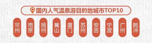 用戶比較青睞前往哪些目的地進行溫泉游?國內(nèi)方向,以江蘇、安徽、浙江以及云南為主,人氣目的地前十名分別為常州、南京、揚州、黃山、廈門、蘇州、安吉、寧波、廣州、騰沖,人氣較高的溫泉(度假區(qū))有天目湖御水溫泉、南京湯山溫泉、常州恐龍谷溫泉、揚州瘦西湖溫泉度假村、黃山醉溫泉度假酒店、廈門日月谷溫泉度假村、廣州碧水灣溫泉度假村、蘇州四季悅溫泉、安吉江南天池溫泉、騰沖火山熱海溫泉。