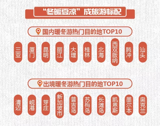 隨著交通運力的不斷提升,國內(nèi)游客開始有條件像“候鳥”一般,在冬季來一場過冬“大遷徙”。值得一提的是,在琳瑯滿目的暖冬游產(chǎn)品中,線路是否具有養(yǎng)生特點,除了溫暖的氣候條件外,還需輔以充沛的日照、水文資源,以及動靜相宜的玩法。綜合來看,全國范圍暖冬養(yǎng)生游目的地主要集中在三亞、廈門、昆明、麗江、大理、桂林、北海、西雙版納、騰沖、汕頭等地;出境方向主要集中在東南亞的清邁、峴港、芽莊、新加坡市,熱帶海島如普吉島、蘇梅島、長灘島,以及長線游如澳洲的凱恩斯、墨爾本、奧克蘭等目的地城市。