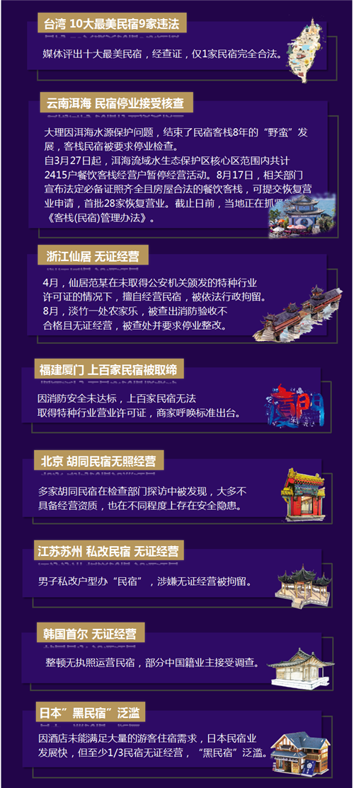 民宿業(yè)從“摸石頭過(guò)河”轉(zhuǎn)為“有規(guī)可循”的經(jīng)營(yíng)管理狀態(tài),仍會(huì)出現(xiàn)“適應(yīng)不良”的問題。2017年,有多家民宿因無(wú)證經(jīng)營(yíng)、消防驗(yàn)收不合格、將商品房私改民宿等被相關(guān)部門查處并要求停業(yè)整治。