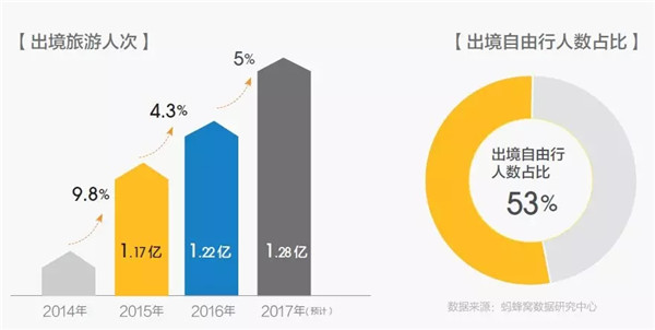 2017年全年中國公民出境游人次將達到1.28億人次,相當于日本總人口,同比2016年增長接近5%。其中,出境自由行人數占比53%。