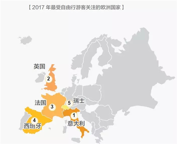 2017年最受自由行游客青睞的歐洲旅游目的地分別是意大利、英國、法國、西班牙和瑞士。其中,由于意大利、法國和瑞士相近,多自由行游客會在規劃行程時選擇“法意瑞”游玩路線,在15天左右的時間里玩轉三個國家。