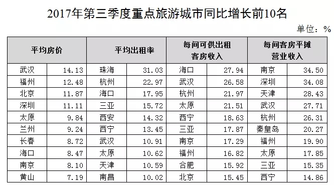 每間可供出租客房收入:增幅位居前10位的城市為???、武漢、杭州、太原、西寧、三亞、南京、福州、合肥、北京,其中??谠龇畲?,為27.94%;降幅位居前10位的城市為麗江、張家界、拉薩、昆明、南昌、沈陽、哈爾濱、銀川、烏魯木齊、南寧,其中麗江降幅最大,為36.67%。