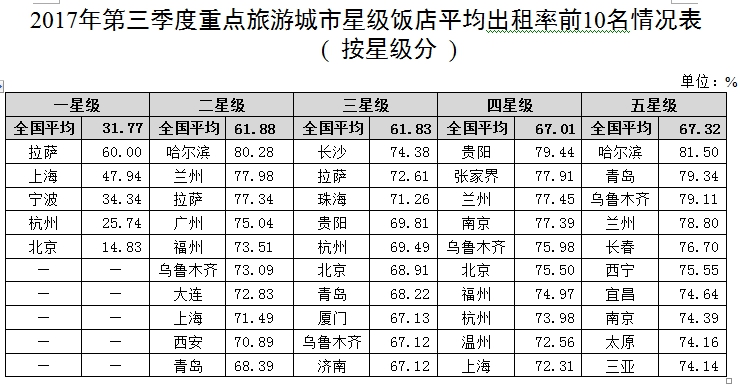 全國50個重點旅游城市共有3761家飯店通過第三季度數(shù)據(jù)審核,占全國總數(shù)的37.37%。其中,五星級飯店575家,占全國五星級飯店總數(shù)的70.04%,四星級飯店1108家,占全國四星級飯店總數(shù)的45.69%,三星級飯店1601家,占全國三星級飯店總數(shù)的32.62%,二星級飯店470家,占全國二星級飯店總數(shù)的25.56%,一星級飯店7家,占全國一星級飯店總數(shù)的9.72%。