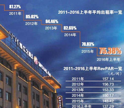 據公開資料,錦江之星旅館有限公司于2010年由H股回歸錦江股份A股。據2011年年報,錦江之星的平均出租率為87.27%,此后逐年下滑,到2015年時已降至78.83%。據2016年半年度報告顯示,2016年上半年錦江之星的平均出租率進一步減少為75.38%。