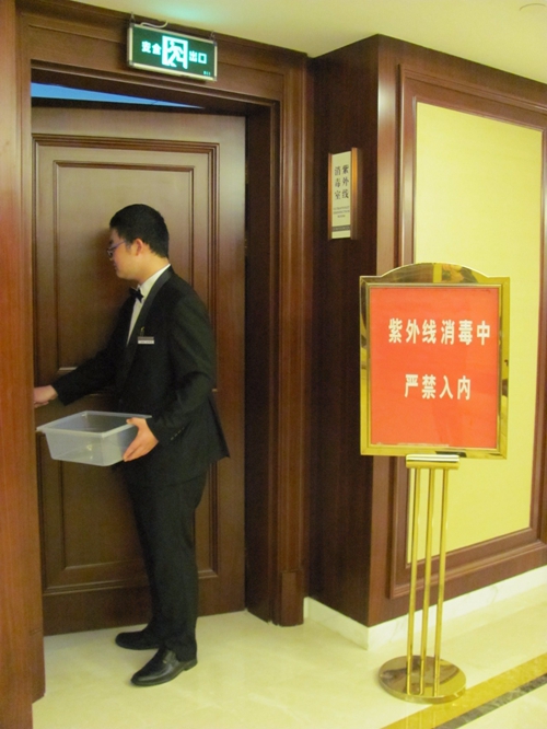 圖為南京東郊國賓館對每間客房退房后都進行紫外線消毒