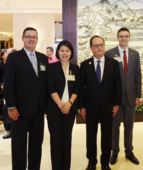 2016年9月4日,雅高酒店集團大中華區(qū)區(qū)域餐飲總監(jiān)/山東區(qū)域營運總監(jiān)柯瑞文(左一)、杭州索菲特西湖大酒店總經(jīng)理范斯先生(右一)和酒店業(yè)主代表/副總經(jīng)理竺麗萍女士(左二)于酒店大堂歡迎法國總統(tǒng)弗朗索瓦•奧朗德。