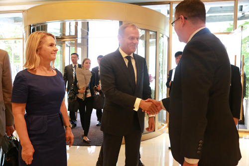 2016年9月3日下午5點,雅高酒店集團大中華區(qū)區(qū)域餐飲總監(jiān)/山東區(qū)域運營總監(jiān)柯瑞文、杭州索菲特西湖大酒店總經(jīng)理范斯先生和酒店業(yè)主代表/副總經(jīng)理竺麗萍女士,于酒店正門口熱情迎接歐洲理事會主席唐納德·圖斯克與他的夫人瑪烏格熱塔。