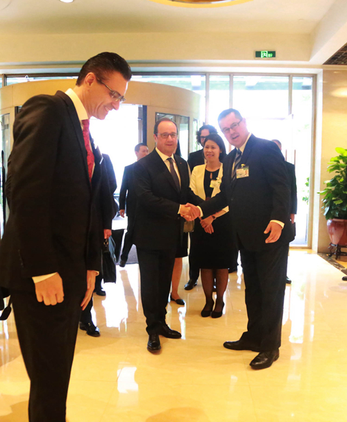 2016年9月4日下午12點30分,雅高酒店集團大中華區(qū)區(qū)域餐飲總監(jiān)/山東區(qū)域運營總監(jiān)柯瑞文、杭州索菲特西湖大酒店總經(jīng)理范斯先生和酒店業(yè)主代表/副總經(jīng)理竺麗萍女士,于酒店正門口熱情迎接法國總統(tǒng)弗朗索瓦•奧朗德。