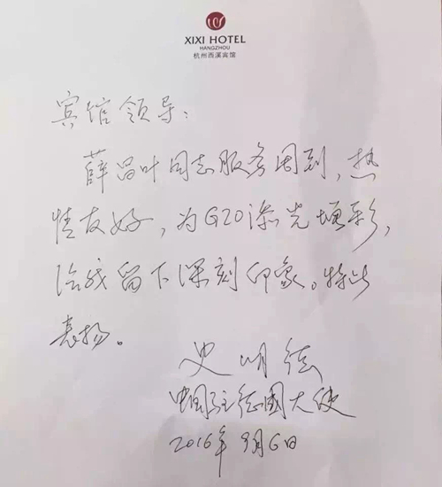 西溪賓館總經(jīng)理還說到,在送別23位大使及各部委領(lǐng)導(dǎo)之時(shí),每一位賓客都贊美了酒店優(yōu)美的自然景色,感謝每一位員工對他們的細(xì)心照顧,讓他們住得十分舒心。多位大使表示,希望有機(jī)會還能來到杭州西溪賓館休息或度假。酒店收到了多封表揚(yáng)信及感謝信,客房部的薛昌葉還收到了駐德國大使的表揚(yáng),表達(dá)對其工作的肯定,贊她為G20添光增彩!