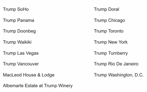 作為紐約當之無愧的“地產大王”,特朗普的房地產版圖已經遍布全球,不僅在全美各地,并且在包括加拿大、巴拿馬、巴西、土耳其、韓國、菲律賓、印度、烏拉圭在內的全球各地都有其投資的辦公大樓、酒店、公寓、賭場、高爾夫球場以及其品牌連鎖設施。