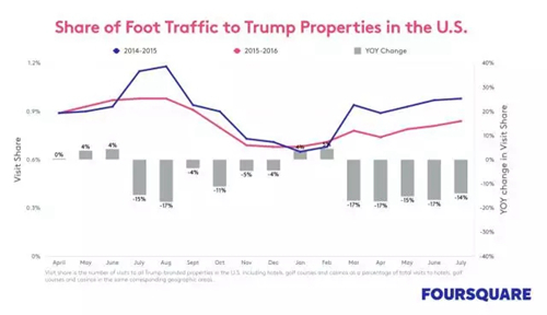 而來自Foursquare的數據同樣表明,從2015年6月川普宣布競選開始,Trump酒店的人流量下降了17%。