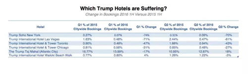 據美國旅游搜索網站Hipmunk統計,2016年上半年全美的特朗普酒店預訂數量的市場份額同比減少58%,可以說是暴跌。該網站的用戶多為城市地區的年輕人,似乎在特意避開特朗普品牌。