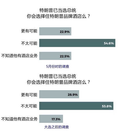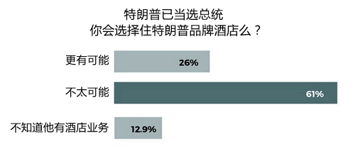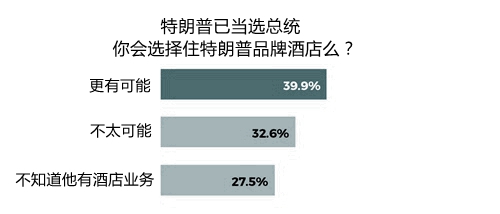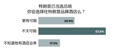 相較5月份,總統(tǒng)競選后6%的人表示他們有可能會住特朗普品牌酒店,但這6%的人并不知道特朗普真的擁有酒店,這和不會住特朗普品牌酒店其實(shí)差不多。