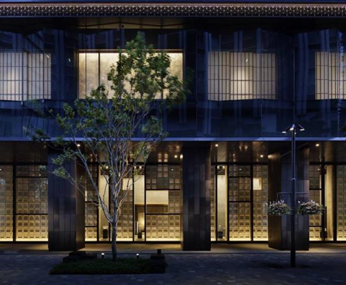 在日本,多數五星酒店都不會獨占一棟大樓,但 Hoshinoya 打破常規,在一眾寫字樓中脫穎而出。Hoshinoya Tokyo 的立面為黑色金屬網格花紋,配以傳統的江戶小紋(Edo Komon)圖案。(江戶小紋流行于 17世紀末的日本,用細小和密集的點狀組成花樣。)