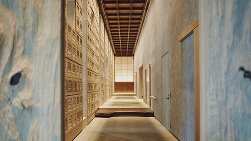 在進入酒店后,一扇厚實的天然日本青柏木門隔出了一片玄關空間,“o-genkan-san”(迎賓)在玄關處歡迎顧客。這個高 5.5米,長而窄的入口形成了一個現代化的檐廊,一邊的墻面整齊擺放著日本栗木和竹子制成的鞋盒,對面為混有砂土的靛藍色粘土墻。