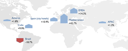 在西班牙中部,馬德里的每間客房可用收益相較去年獲得了兩位數的增長,表現出色的有Tryp Gran Vía, Meliá Galgos以及位于機場附近的酒店。位于西班牙東部的酒店獲得了將近1,300萬的收益增長,其中40%來自于第三季度,許多適合商務出行及休閑旅游的地區得益于假日的積極影響,如阿利坎特,巴塞羅那,塔拉戈納的帕爾馬馬略卡島,以及美利亞官方網站在線預訂平臺的銷售實力都是重要原因。