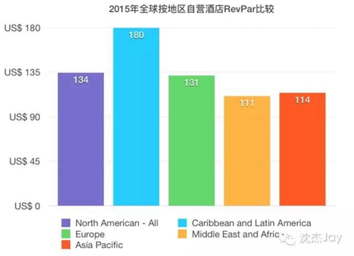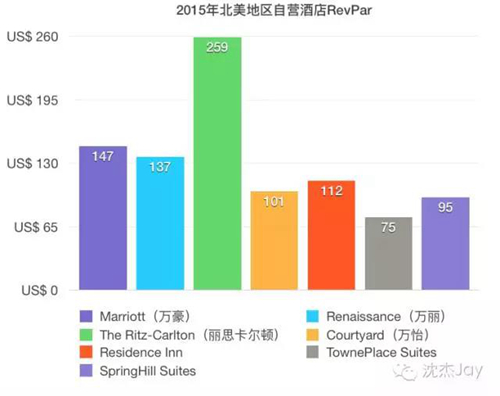 2015年各品牌的RevPAR均較前一年有提升,從品牌上來看,北美地區麗思卡爾頓的RevPAR達到了259美元,遠遠高于其他品牌。