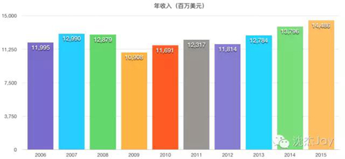 從地域分布來看,2015年來自北美地區的收入占了總收入的78%。