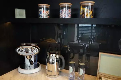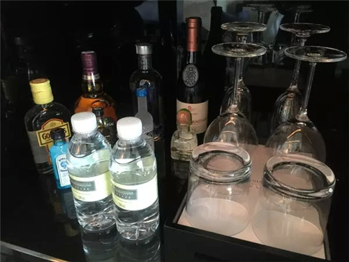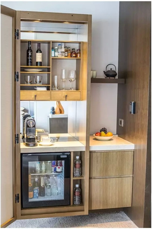minibar不是迷你的酒吧。從一個小冰箱開始,里面有水(最基本的,還要看品牌和種類)、果汁、軟飲、酒類、糖果等。延伸到吧臺柜面上和各個抽屜里,典藏一些酒店精選特色飲料小食,還配備了時下流行的膠囊咖啡機,各色茶包,各類咖啡杯碟和酒杯等。