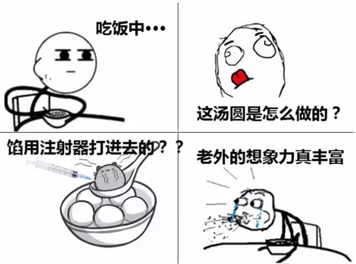 印象最深的一次,吃湯圓的時候,他很認真的問我,里面的餡兒是不是用注射器打進去的,因為外面明明沒有封口啊......