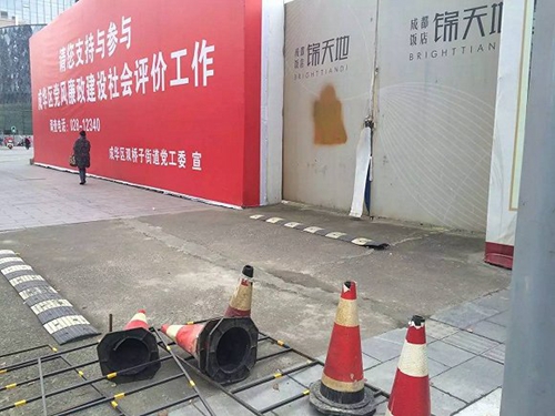 該項目早在2015年初便亮相施工,引發了社會的廣泛關注。但從2015年底停工至今已有一年時間,僅打了地基。截止發稿時,成都飯店錦天地的新浪微博和微信公眾號的最新動態分別停留在2015年10月13日和2015年10月28日,內容均未涉及停工。