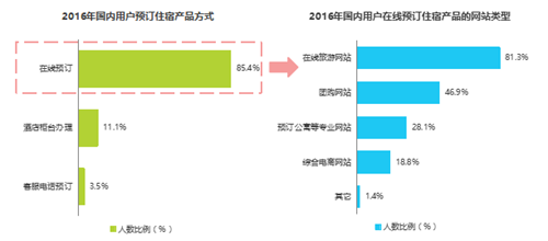 在用戶層面,預訂渠道發生了變化,線上預定為主流趨勢,在各類渠道中占比達到了85.4%。目前在線預訂以綜合類在線旅游網站為主,團購網站進入市場較晚但發展速度快位居第二。除了加強官方的預定渠道,其他在線預訂預訂渠道不可忽略。
