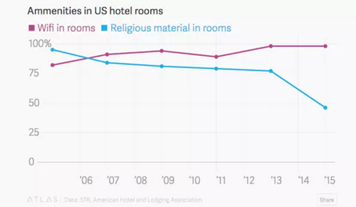 作為酒店“設施”,Wi-Fi 和圣經的占比變化(截圖來自 Quartz)