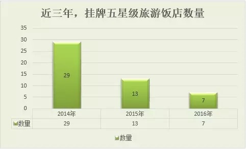 相較之下,2016年酒店掛牌上星數量則寥寥無幾,輝視網從中國旅游飯店業協會官網獲悉,截止目前,2016年全國掛牌五星級酒店僅7家,遍布于上海、湖北、湖南、江蘇、重慶等地,具體名單如下: