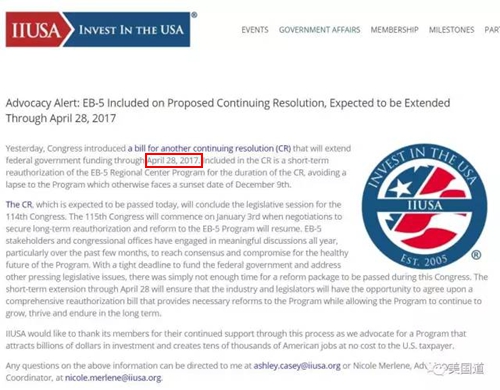 而就在美國(guó)時(shí)間12月7日,IIUSA的官方網(wǎng)站上已發(fā)布通告,正式確認(rèn)EB-5現(xiàn)行法案已經(jīng)包括進(jìn)了持續(xù)決議案(CR-Continuing Resolution)的順風(fēng)車,通過(guò)周五兩院的投票后,就將延期至2017年4月28日。新的法案可能會(huì)將最高投資要求從50萬(wàn)美元提高到80萬(wàn)美元(高失業(yè)率地區(qū)),從100萬(wàn)美元提高到120萬(wàn)美元(低失業(yè)率地區(qū))。