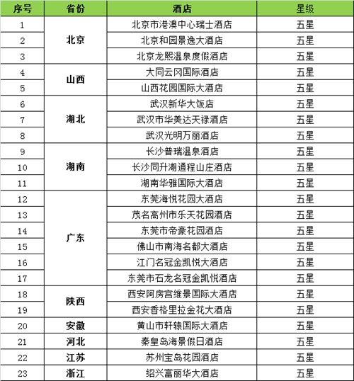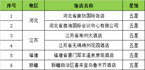 新聞來源:宏輝智通 發布日期:2016-12-15 瀏覽次數:3258河北省廊坊國際飯店、河北省渤海國際會議中心有限公司、江蘇省常州大酒店、江蘇省無錫錫州花園酒店等六家飯店的五星級旅游飯店資格。