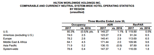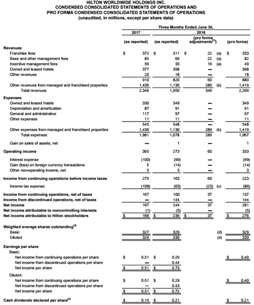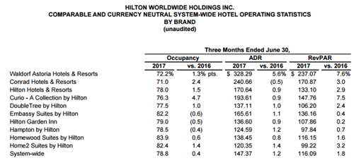 截至 2017年6月30日的第二季度,希爾頓的核心財(cái)務(wù)數(shù)據(jù)如下: